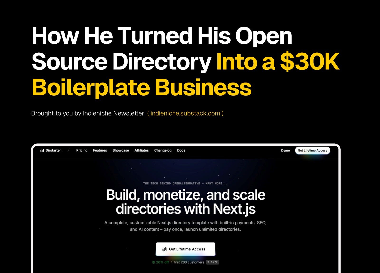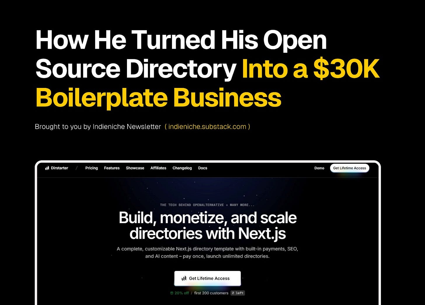 After his OpenAlternative story became one of Indieniche’s most read features, Piotr returns to share how he turned that success into Dirstarter, a $5K/month boilerplate built from the same codebase.